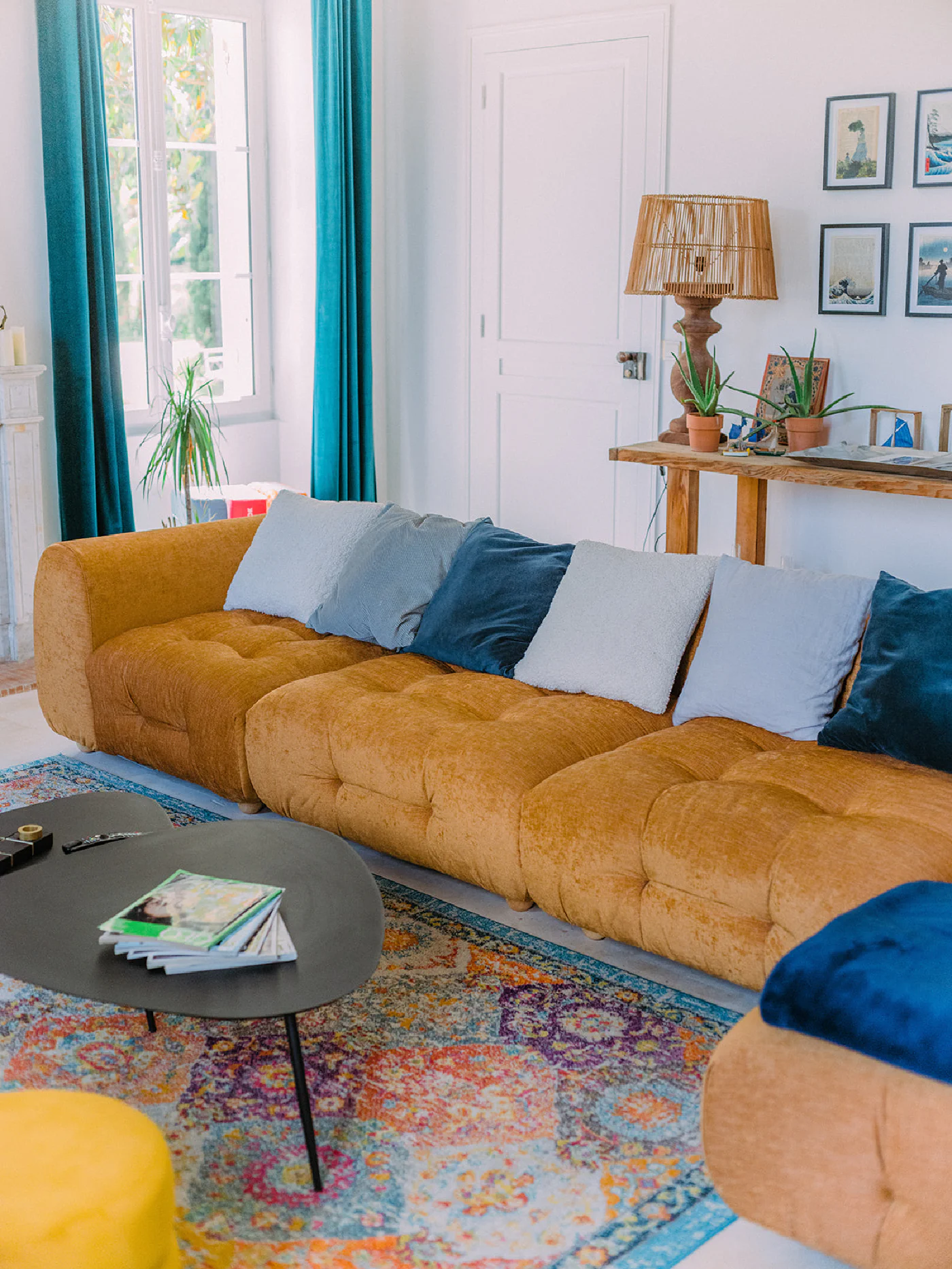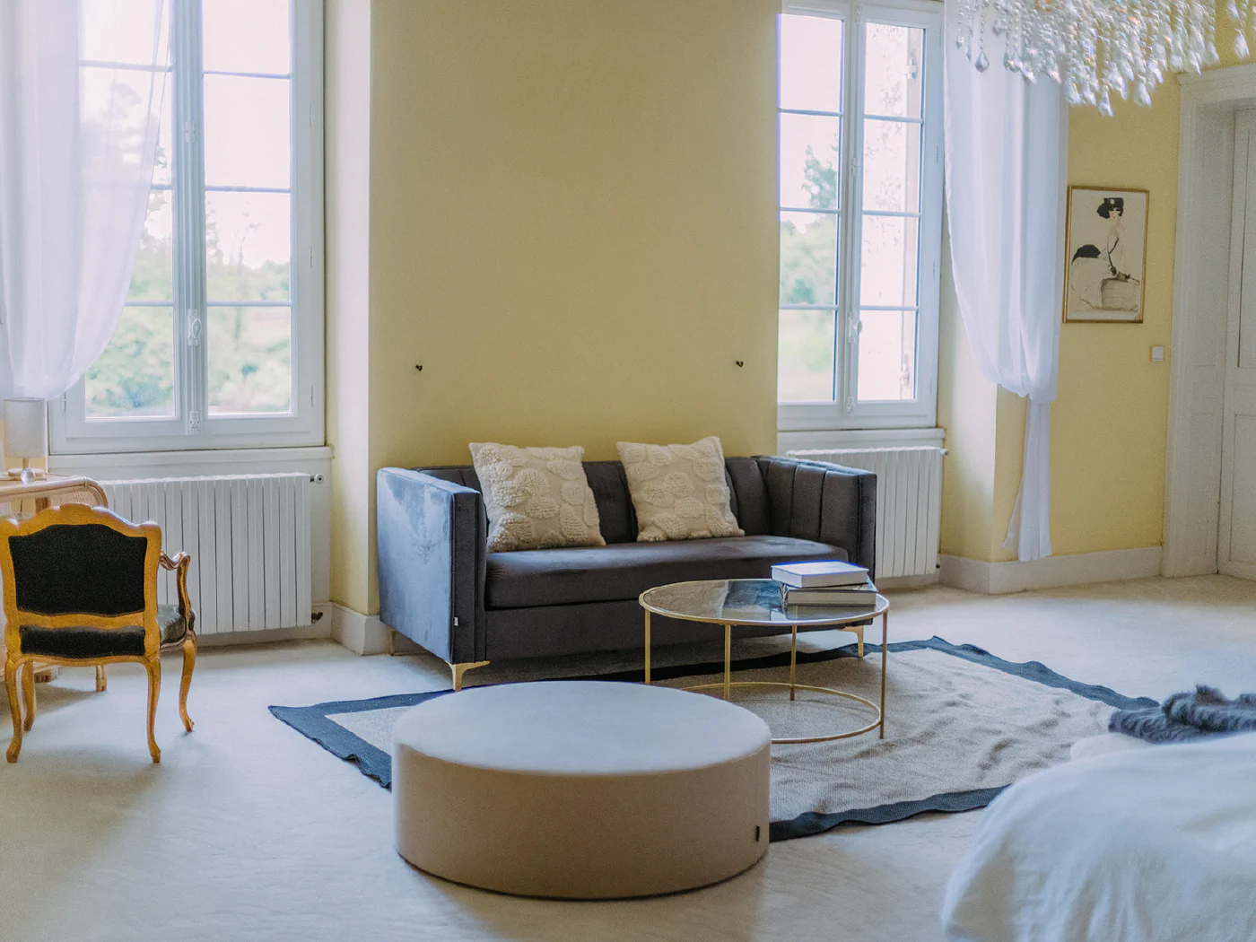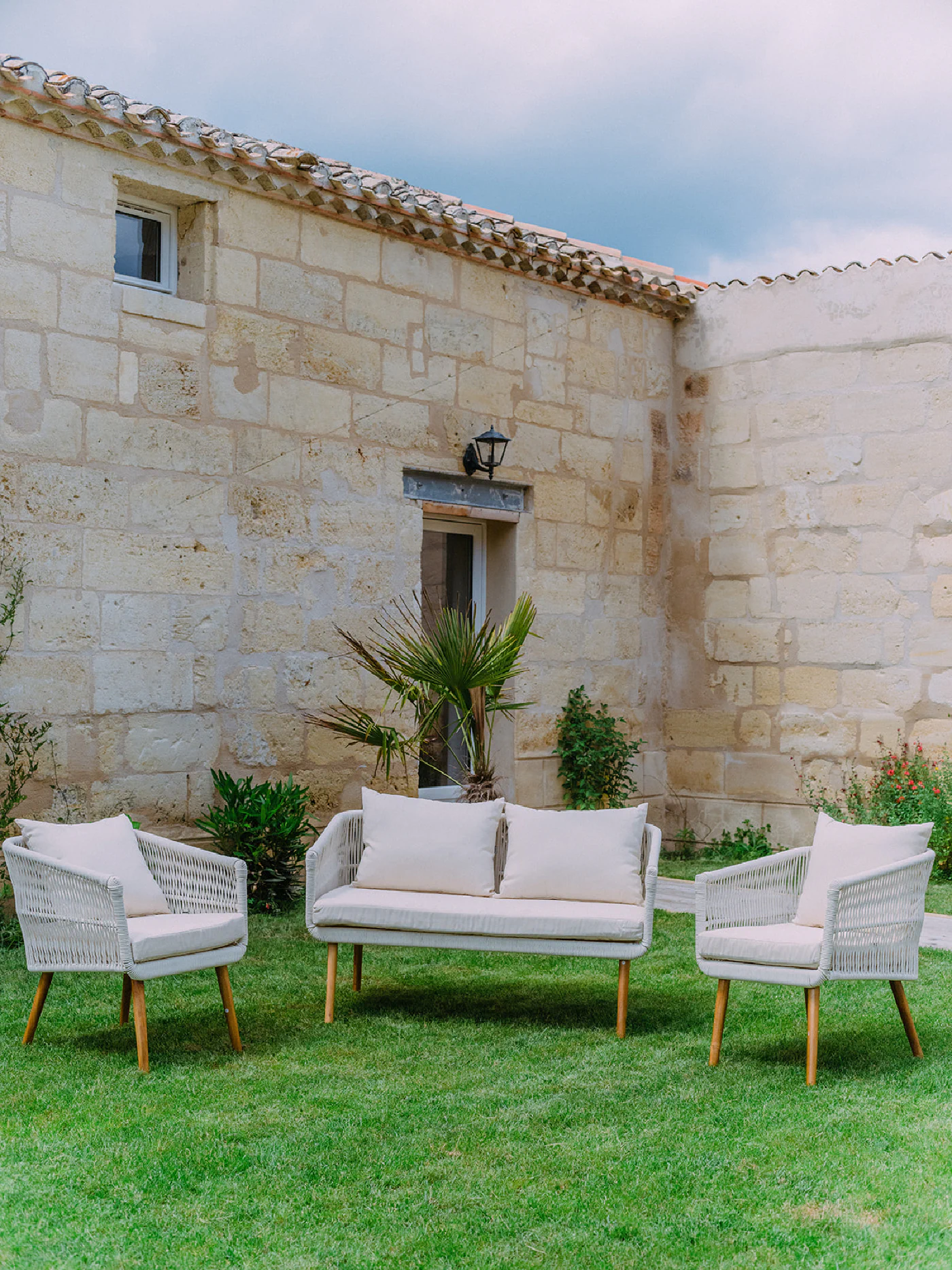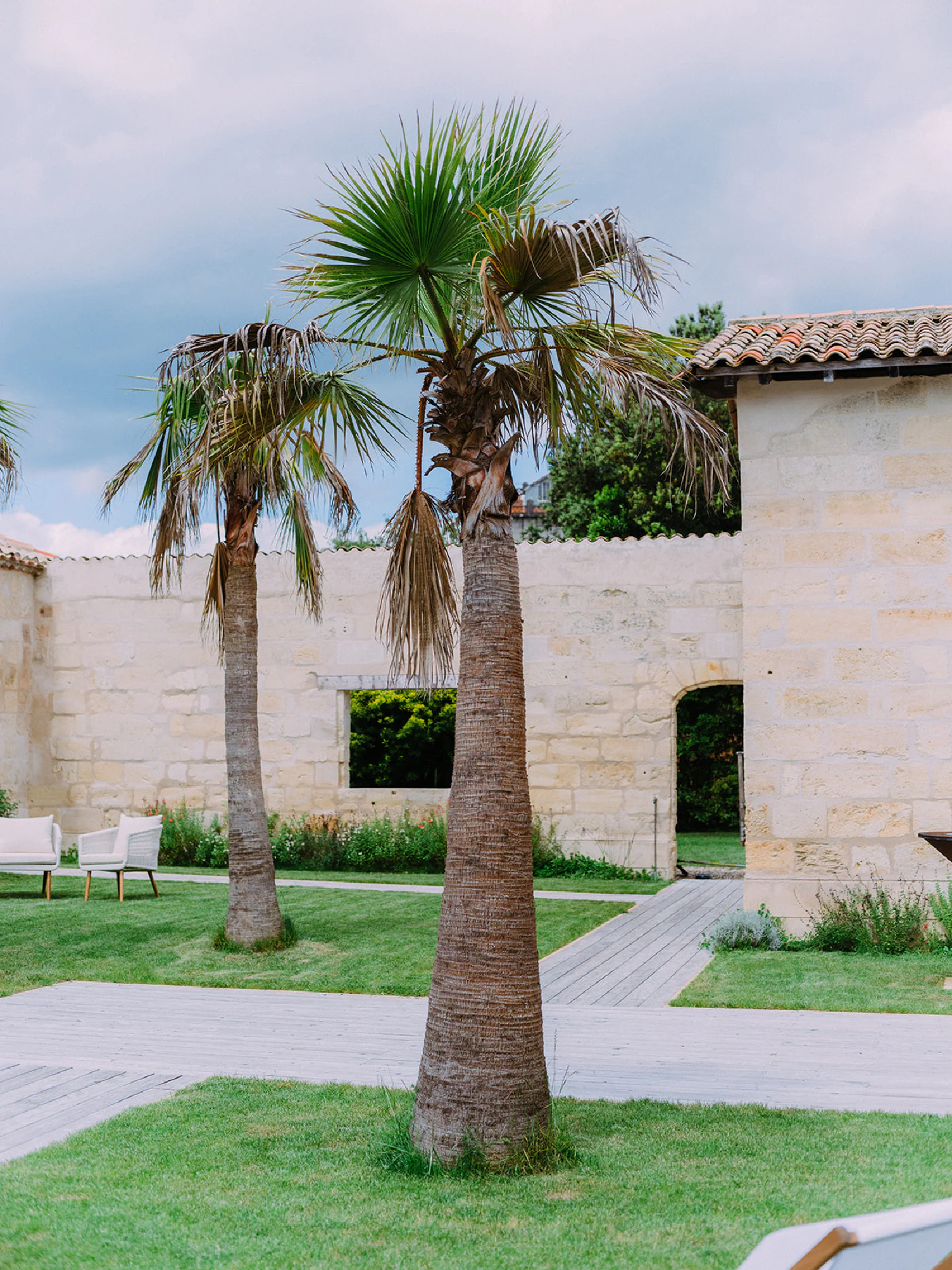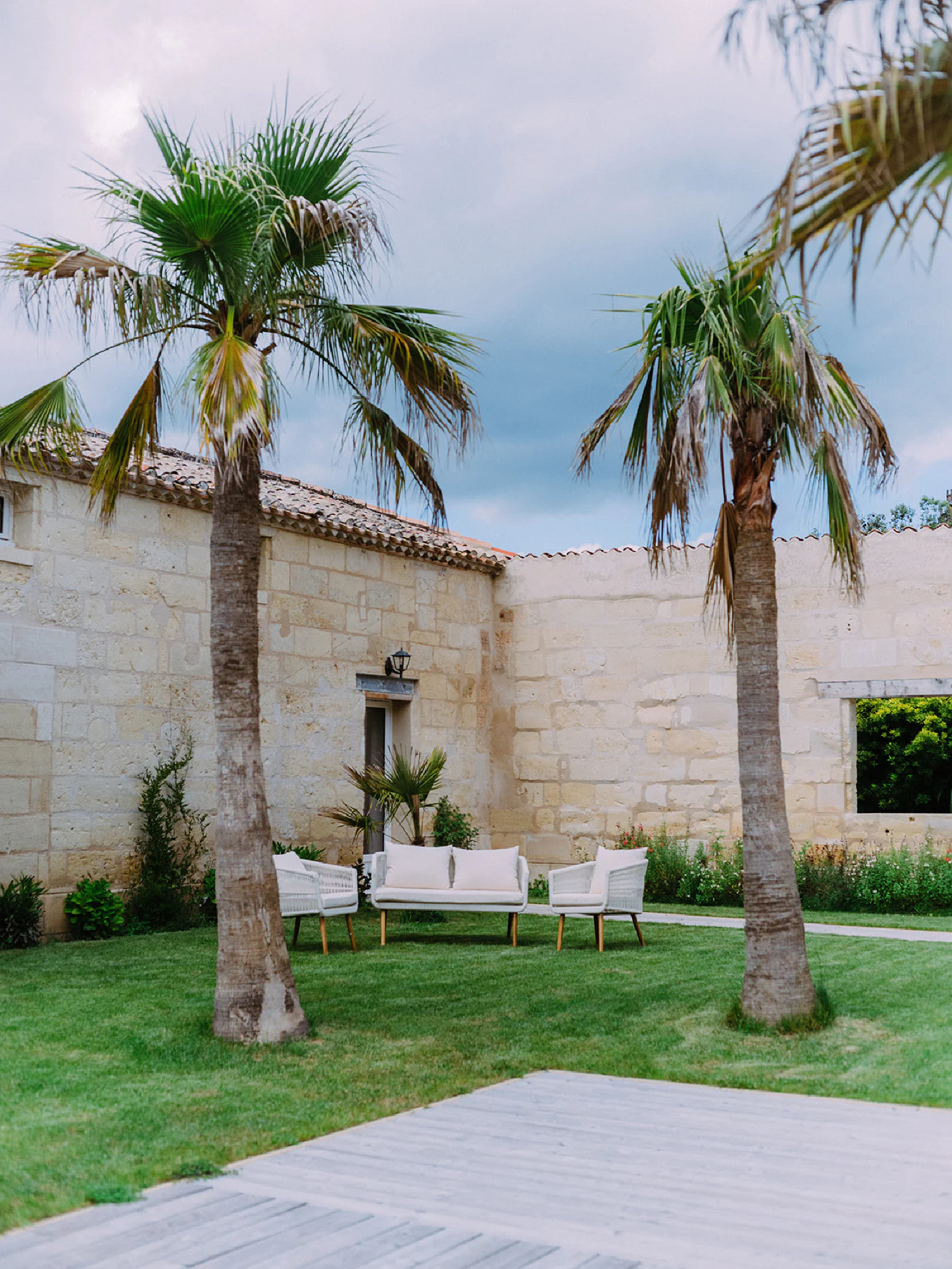 Les pierres blondes du Libournais, les hautes fenêtres ouvertes sur les jardins, les toitures à quatre pans surmontées de girouettes racontent cinq siècles d’histoire. À l’intérieur, poutres apparentes et cheminées monumentales dialoguent avec une restauration soignée qui a su préserver l’âme des lieux tout en offrant le confort contemporain.